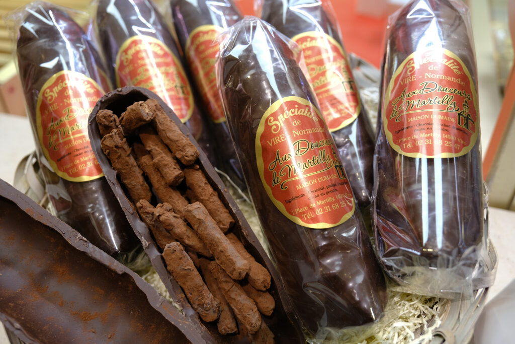 Pour une touche sucrée et originale, la Maison Dumaine propose une andouille en chocolat ! Cette spécialité se compose d’une coque en chocolat garnie de petites andouilles en praliné feuilletine, un vrai régal pour les gourmands.
