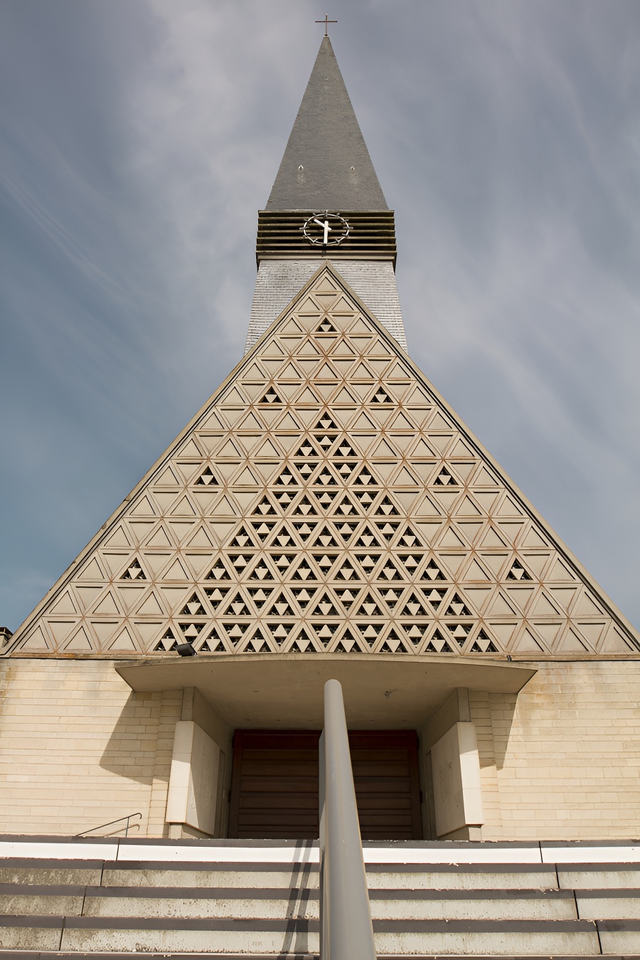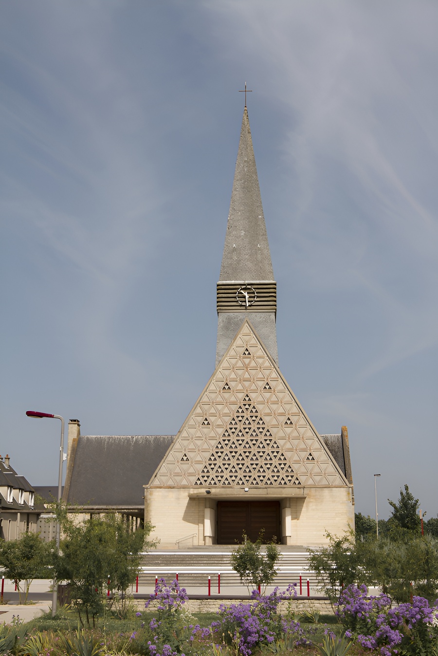 La structure est en béton armé, doublée d’un parement en pierre calcaire de Bourgogne, la totalité de la toiture est faite d’ardoises d’Anger. Les trois nouvelles cloches sont conçues à partir de la fonte des anciennes et installées en 1955 par la fonderie Cornille Havard située à Villedieu-les-Poeles. La structure du clocher et le système d’électrification des cloches (appareils de mise en volée et de tintements, minuterie) ainsi que l’horloge sont le travail de la société Briard Roy basée à Sainte-Austreberthe près de Rouen, toujours en activité aujourd’hui. Le gros du chantier est terminé à la fin de l’été 1956, la consécration a lieu en septembre 1956.
