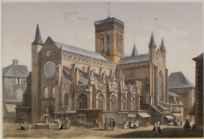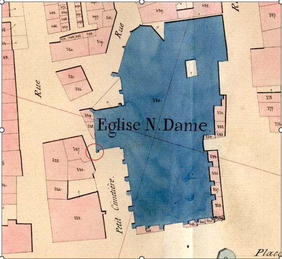 Avant la Seconde Guerre mondiale, le vaste parvis et les marches n’existaient pas : un immeuble occupait l’espace. Un passage étroit, la rue du Petit-Cimetière, permettait alors de rejoindre la rue Saulnerie. Ce passage était si resserré que les essieux des charrettes ont creusé la pierre d’angle de l’église à force de frottements.