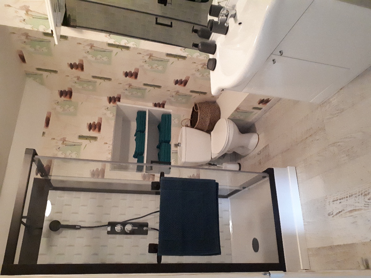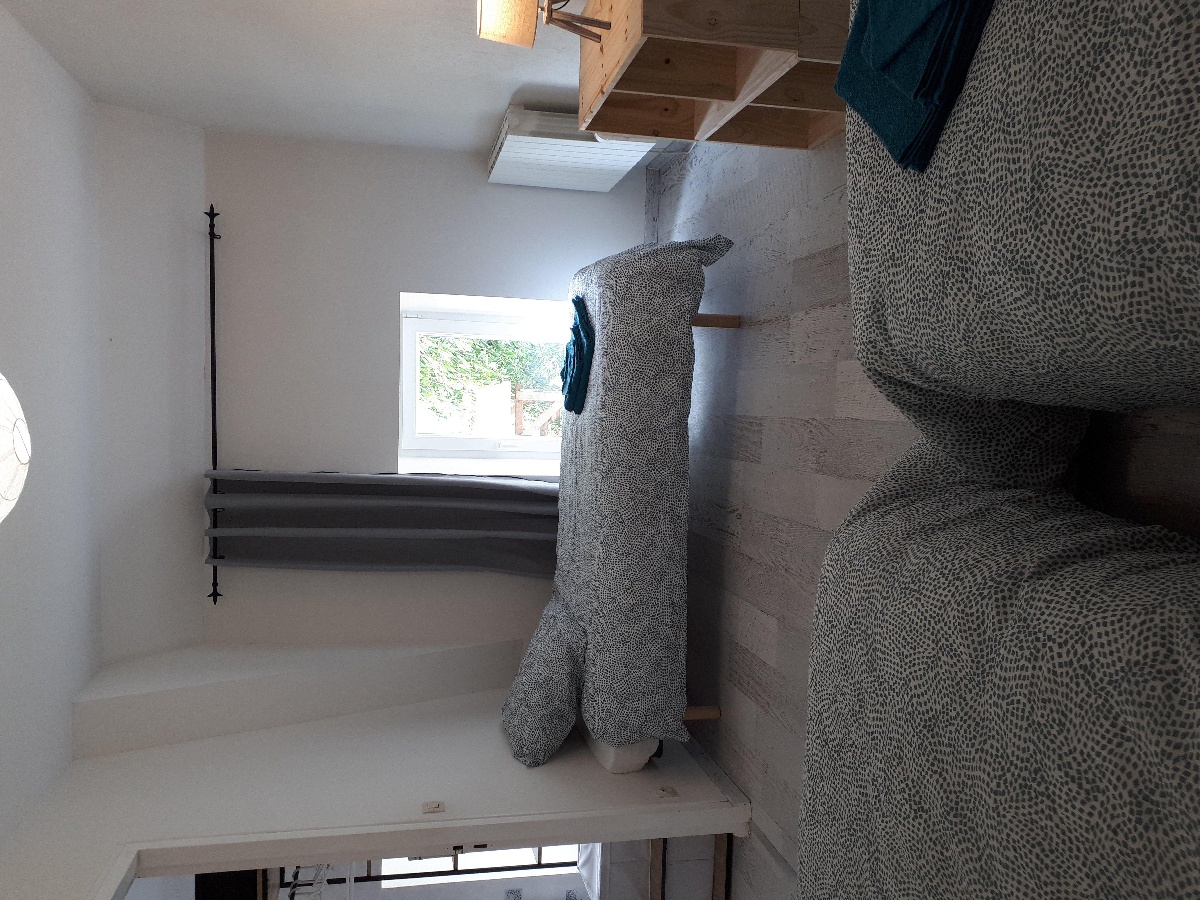 A l’étage, 2 chambres avec un grand lit 180 ou 2 lits séparés 2×90 pour la première puis la seconde chambre composée de 3 lits simples 3×90.