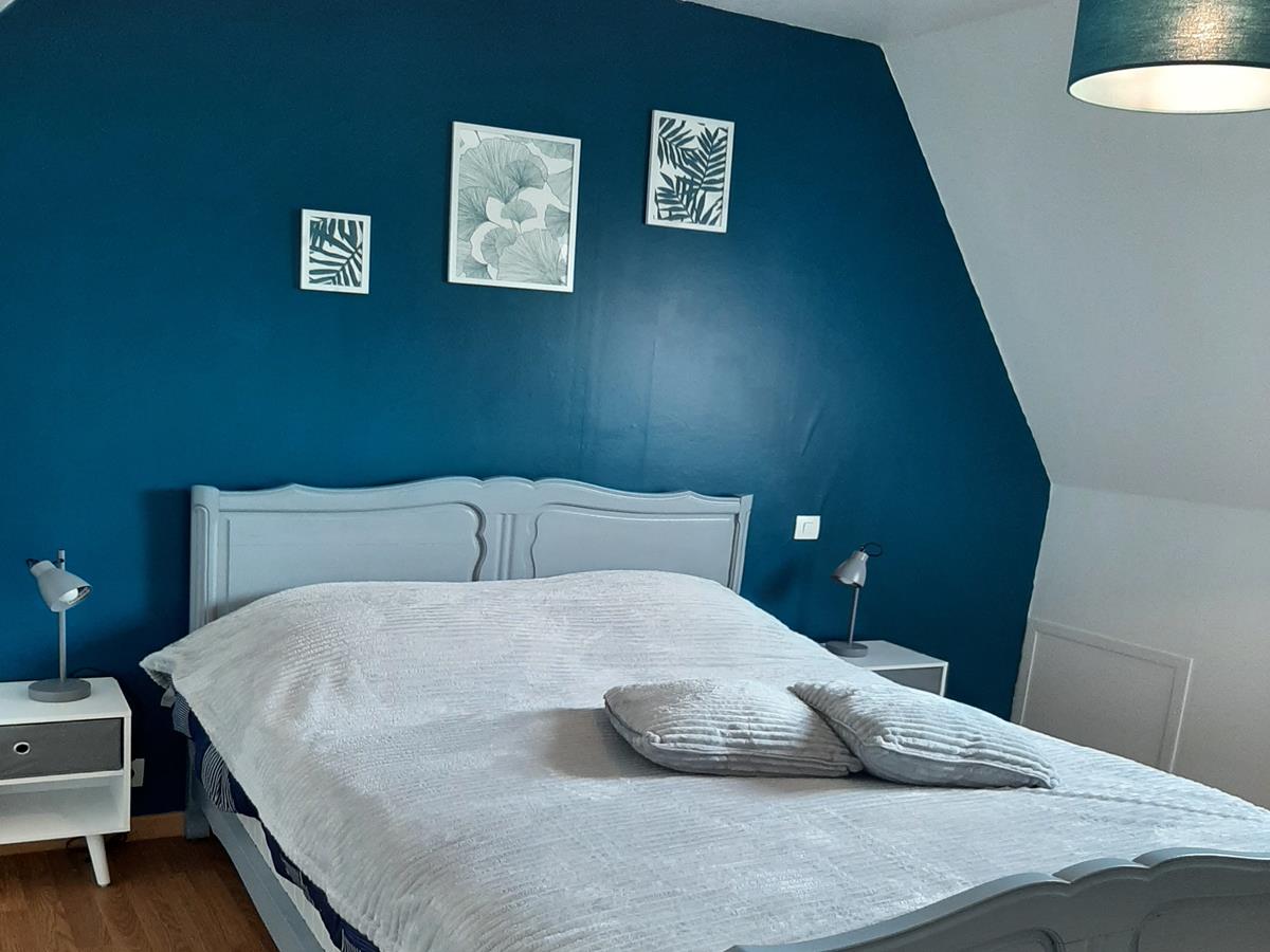 – Chambre bleue à l’étage, 1 lit double (140×190), armoire.