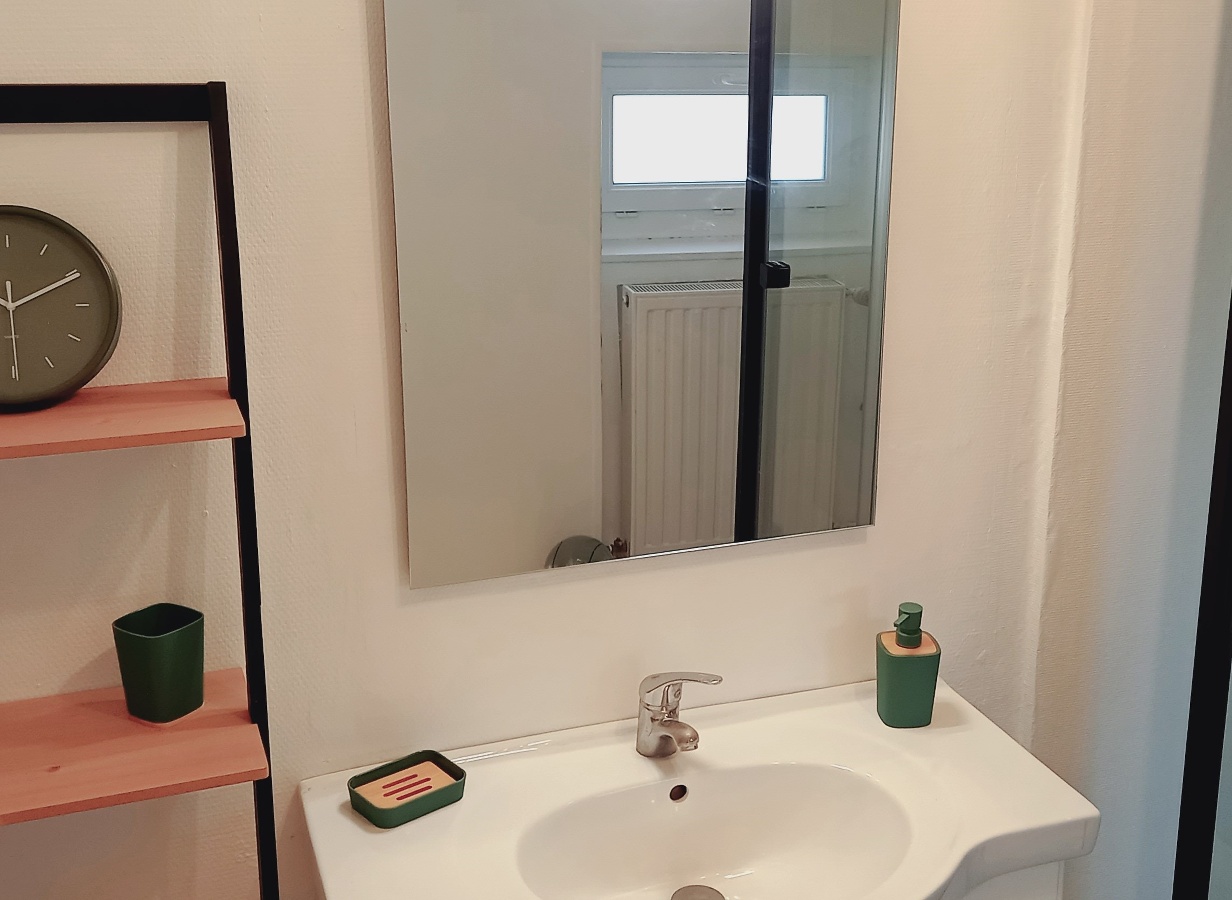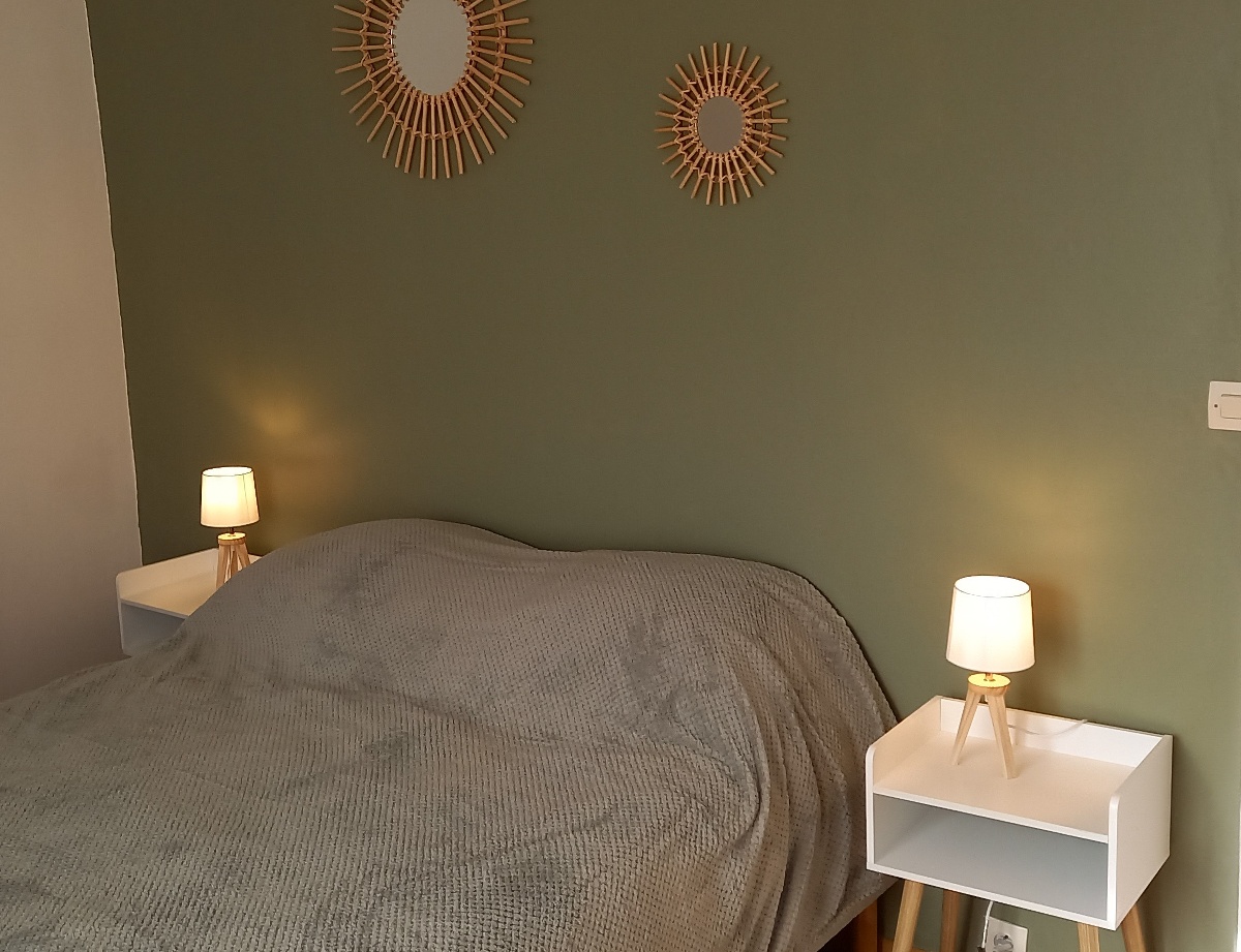 – Chambre verte au RDC, 1 lit double (140×190), penderie, coin bureau.