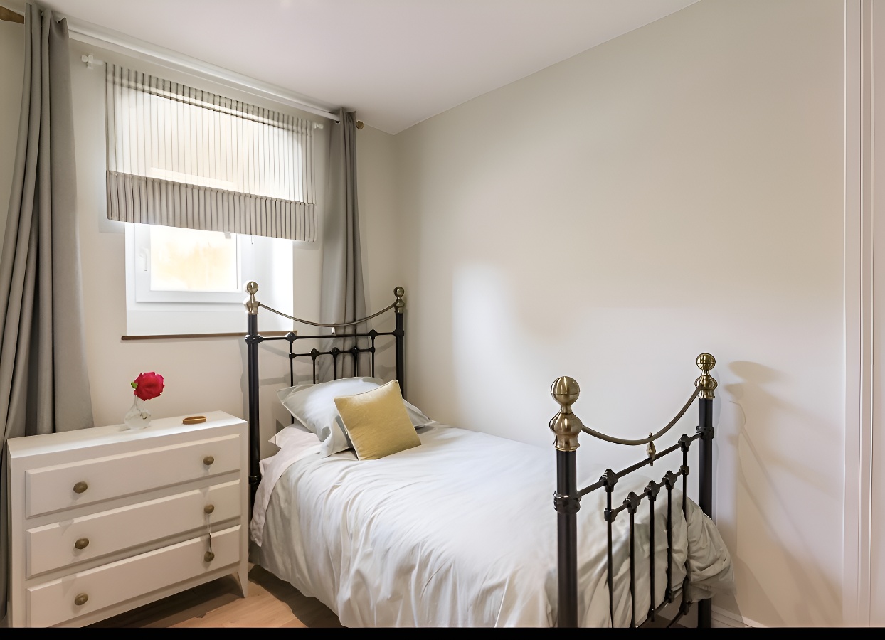 Un petit couloir intérieur vous mène à la chambre principale avec salle de douche attenante, une salle de bain séparée et une deuxième chambre « single ».