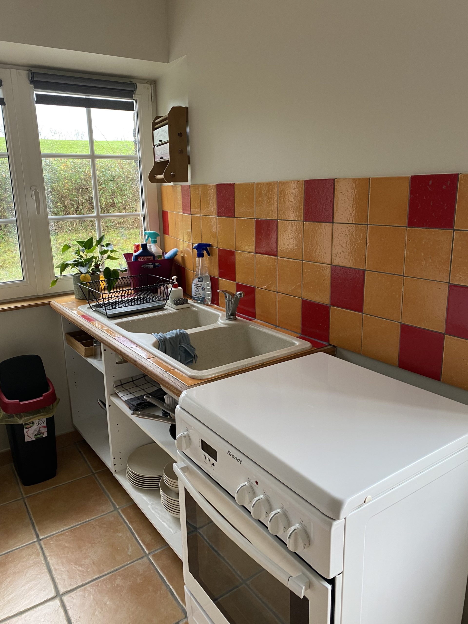 Cuisine ouverte avec les équipements de base (micro- ondes, cafetière Senseo, gazinière, frigo etc ..), un espace repas.