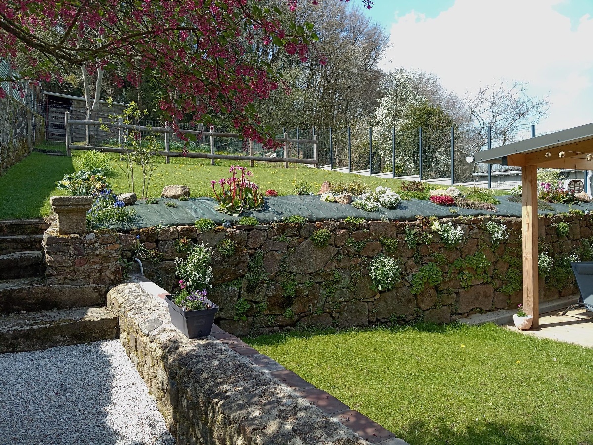 Cette maison indépendante est située dans le quartier Saint Anne sur les hauteurs de Vire : accès par 2 escaliers de 20 marches. Le rez-de-chaussée comporte un séjour avec espace salon et poêle à bois (canapé : possibilité 1 couchage supplémentaire) et espace cuisine, un WC indépendant. L’étage comprend une chambre 2 personnes « Charlot »(1 lit 160 cm), une chambre 2 personnes « Musique » (2 lits 90 cm), salle d’eau, WC indépendant. Espace bien-être au 1er étage avec spa, espace bureau. Le gîte dispose de plusieurs espaces extérieurs : une terrasse couverte avec salon de jardin, cuisine d’été avec plancha et chaises longues , un jardin suspendu et une cour paysagée devant le gîte avec terrain de pétanque. Petit jardin aromatique. Volets roulants électriques. Parking communal gratuit à 50 mètres du gîte. Vous pourrez faire la connaissance de Simba et Scar, les 2 biquettes présentes dans un enclos au bout du jardin.