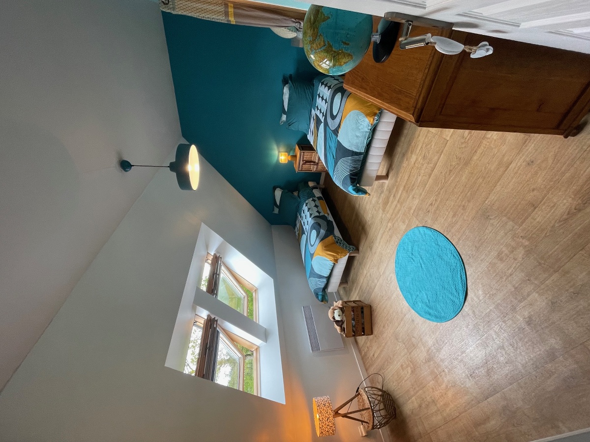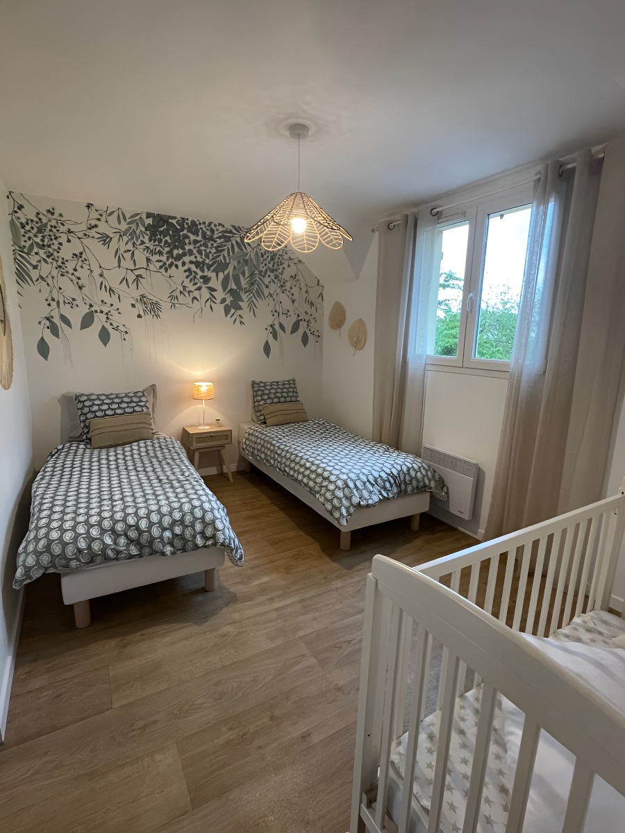 – 1 chambre 3 personnes (2 lits 80cm modulables en 1 lit 160cm, 1 lit 140cm ) avec petite salle de bain attenante