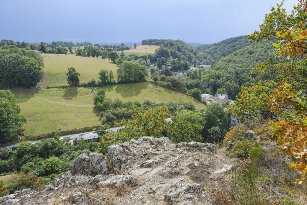 Depuis le Rocher des Rames, le panorama est saisissant. Laissez votre regard se perdre entre la Vire, les collines et les forêts. Le contraste des maisons blotties sous les arbres, la lumière changeante sur les champs et ce sentiment d’être hors du temps : tout invite à une balade contemplative.