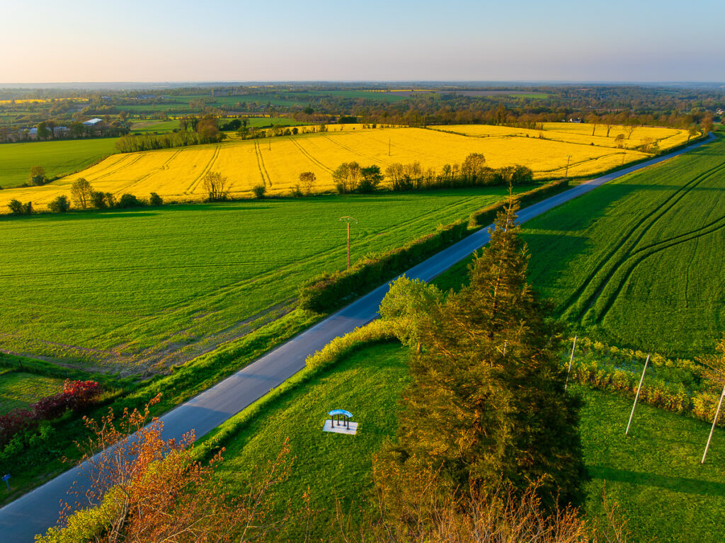 Depuis la table d’orientation de Caumont-l’Éventé, notre regard se perd sur cet océan de verdure. Ici, le bocage s’étend à perte de vue, tel un patchwork où se mêlent les nuances de vert tendre et de jaune éclatant. Ici, la vue s’ouvre sur des horizons lointains : la forêt domaniale de Cerisy, la cathédrale de Bayeux, les éoliennes de Sallen, et, par temps clair, les plages du Débarquement à une trentaine de kilomètres.