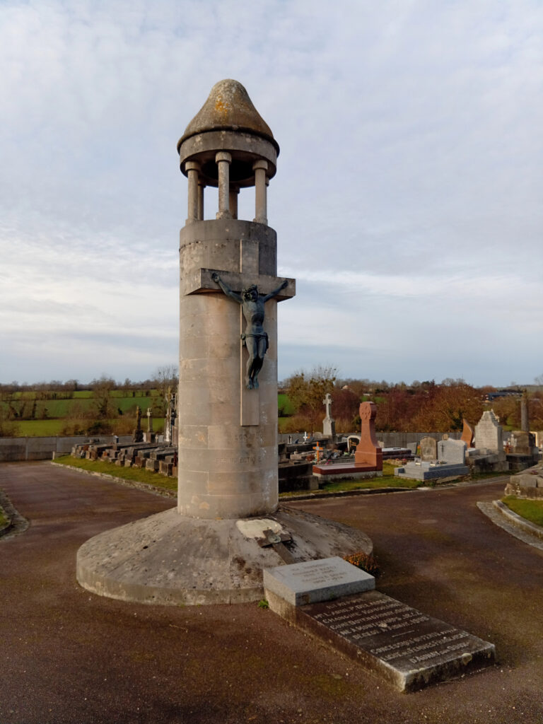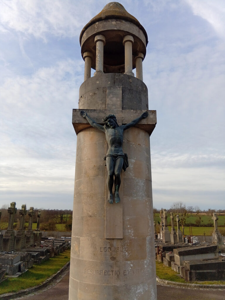 À Aunay-sur-Odon, un monument intrigue dès l’entrée du cimetière : une colonne de pierre d’environ 6 mètres de haut, surmontée d’un petit pavillon orné de colonnettes et son fût décoré d’un Christ en bronze. C’est une lanterne des morts réalisée par le sculpteur Lucien Fenaux, un artiste reconnu du 20e siècle.